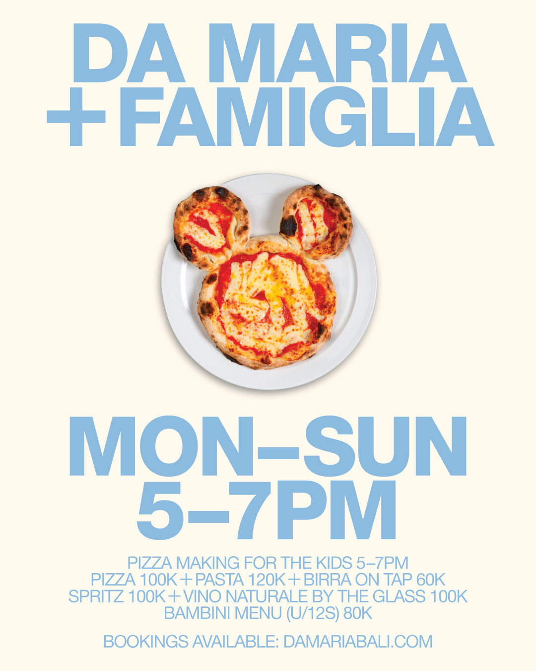 Parents can unwind and savour a selection of our signature pizzas and pasta specials, starting from just 100k. Da Maria Italo classics are also on offer, Campari Soda on tap and Indonesia’s first pétillant naturel – Lazarus Pulp pouring by the glass for 100k, alongside locally crafted Island Brewing beer.